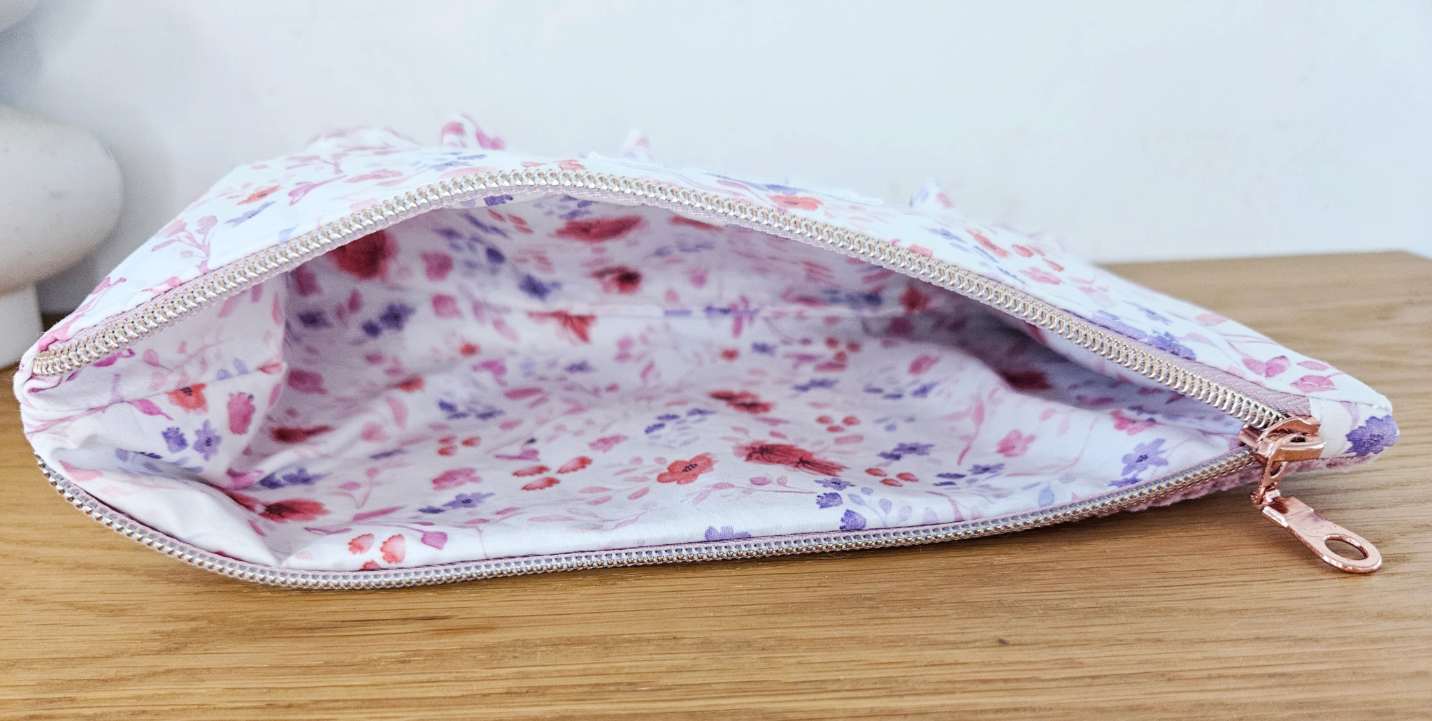 Confectionnée en velours côtelé lavande et coton fleuri aquarelle, elle allie douceur, élégance et praticité. Sa fermeture éclair permet de garder vos affaires bien protégées.