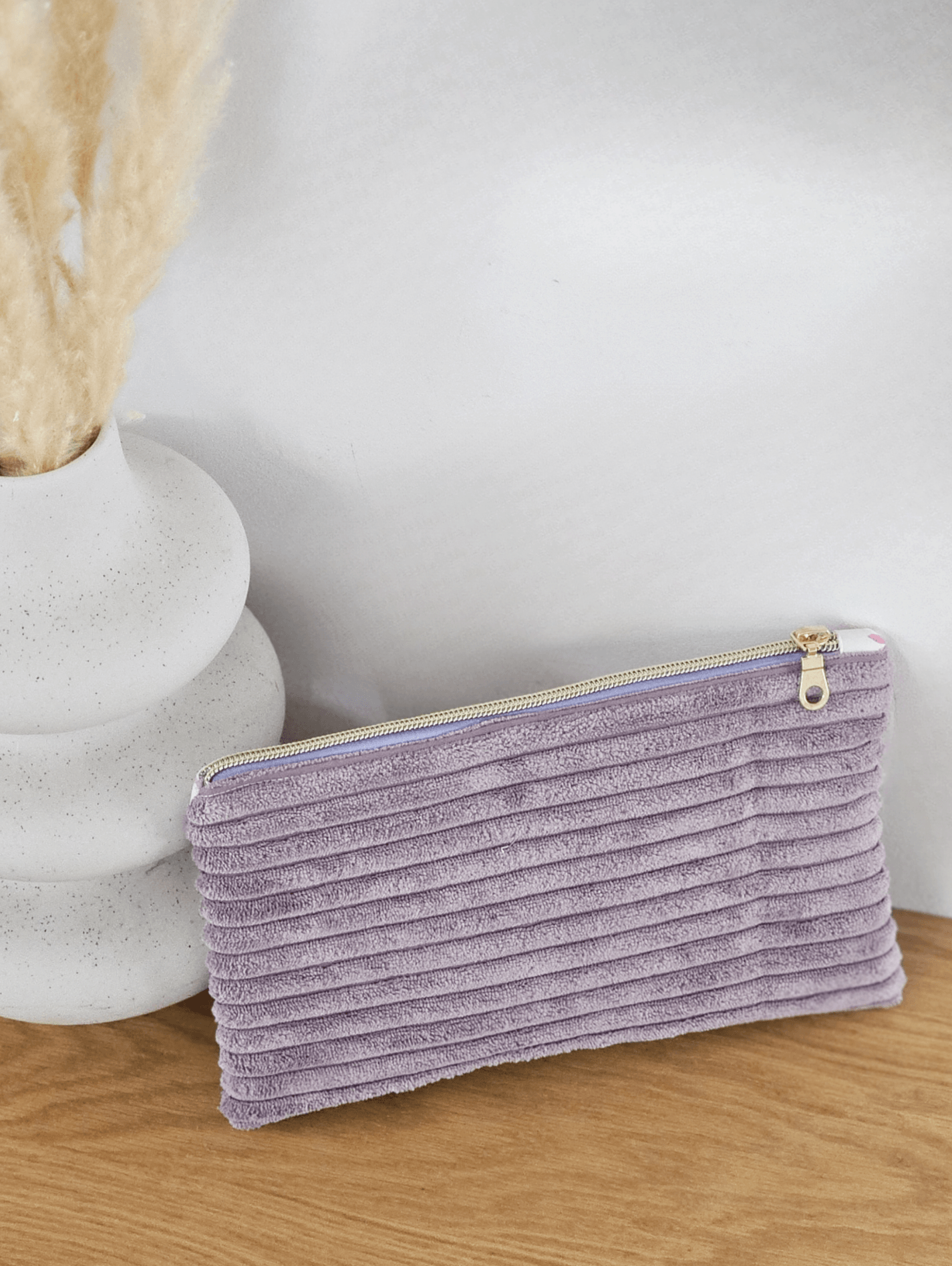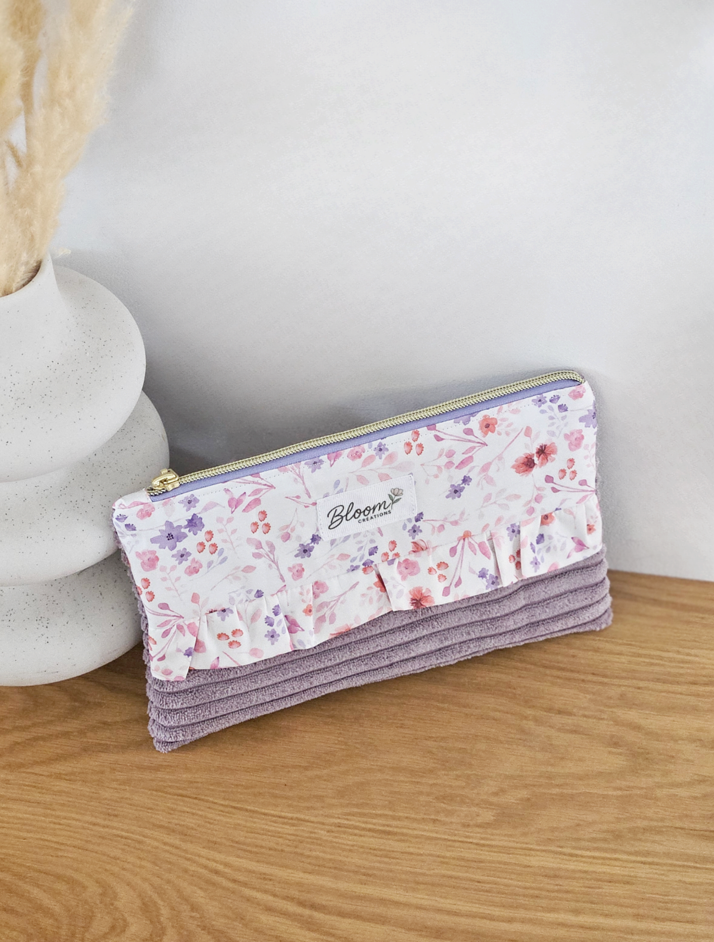 Cette pochette zippée artisanale en velours côtelé lavande et coton fleuri aquarelle a été pensée pour vous accompagner au quotidien.