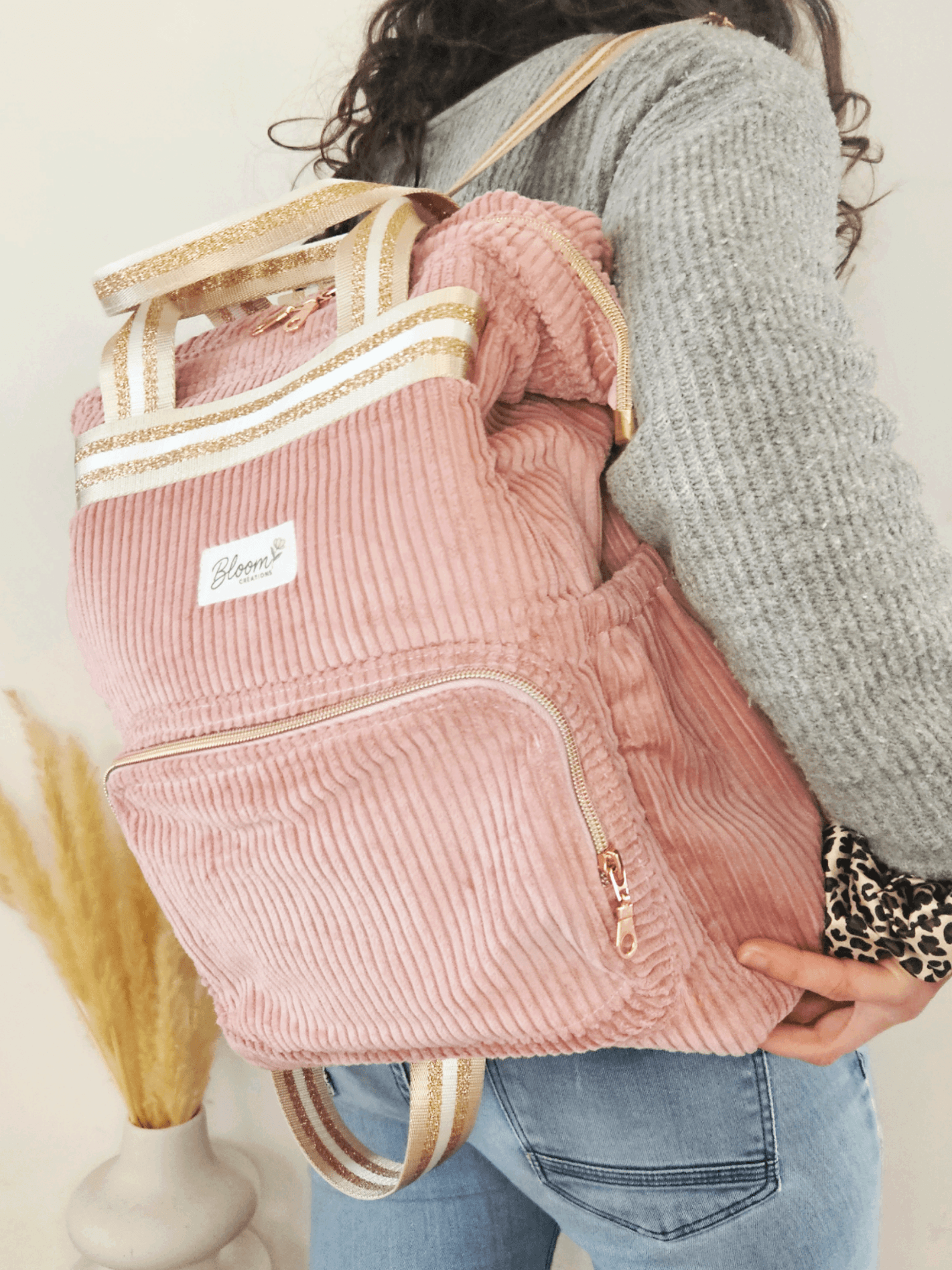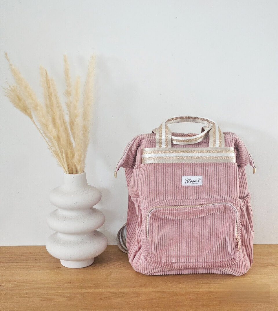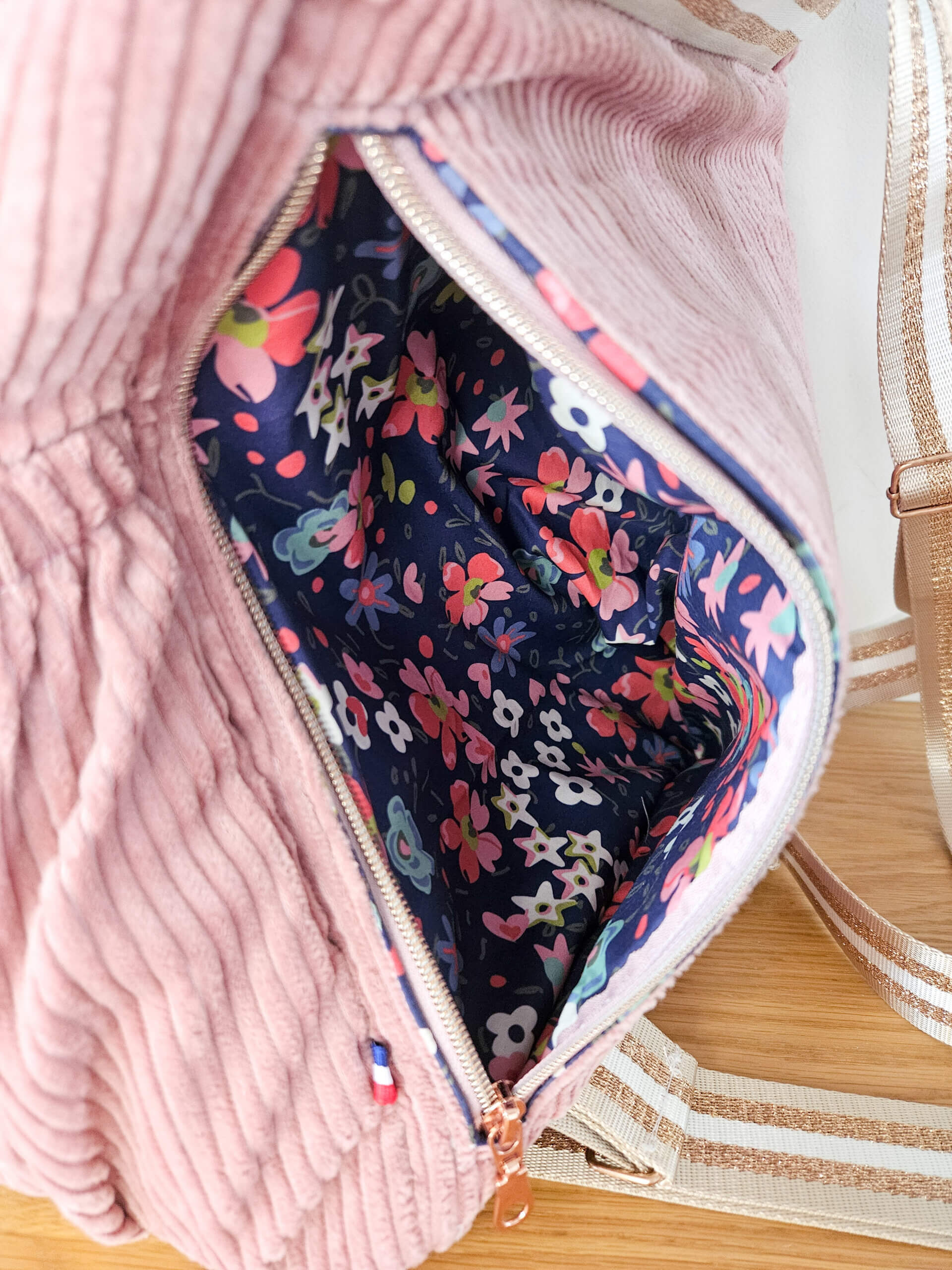 Sac à dos modèle Ava, en velours côtelé vieux rose et intérieur bleu foncé à petites fleursSac à dos en velours – « Ava »