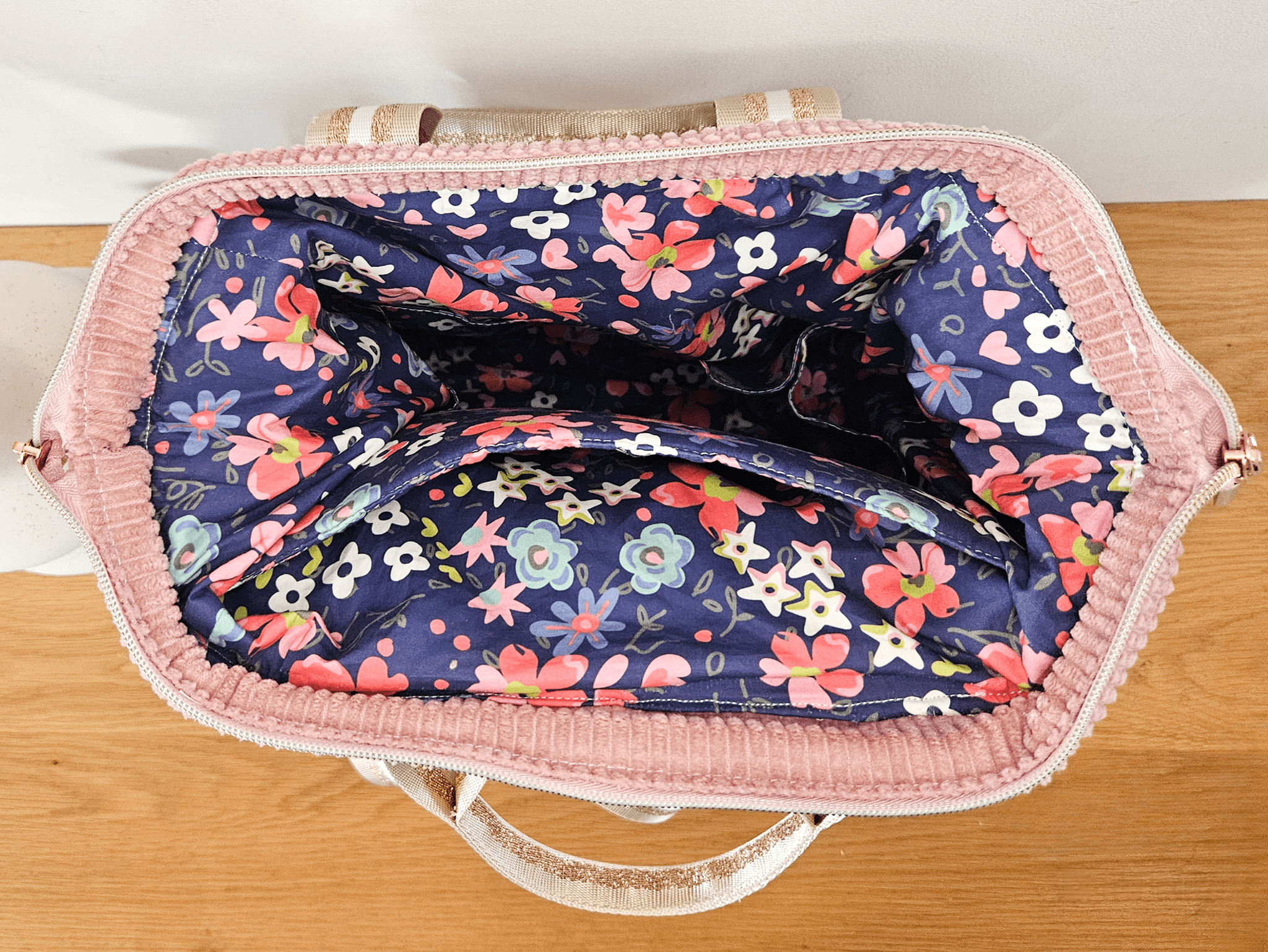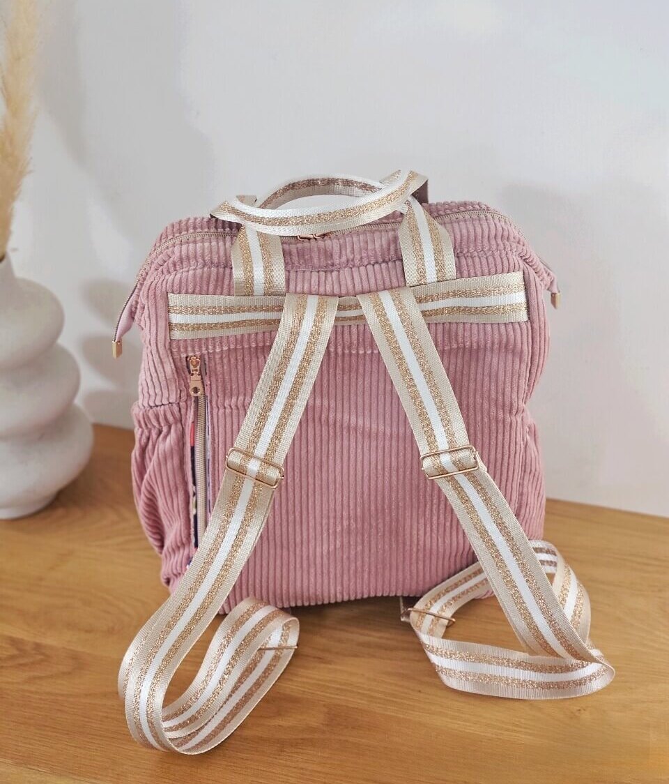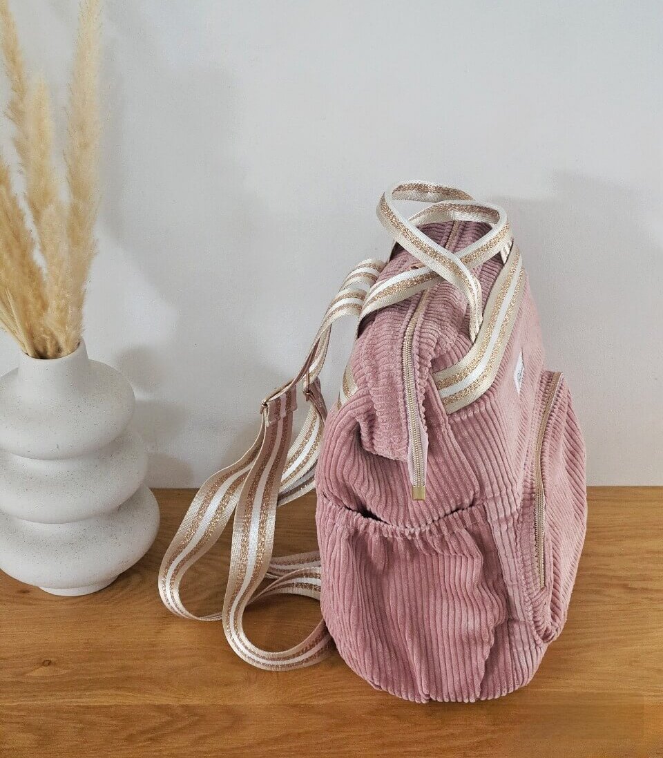 Sac à dos modèle Ava, en velours côtelé vieux rose et intérieur bleu foncé à petites fleursSac à dos en velours – « Ava »