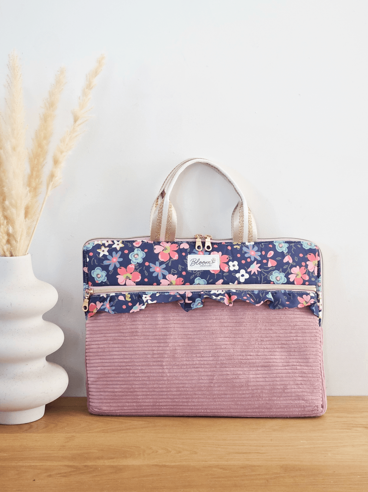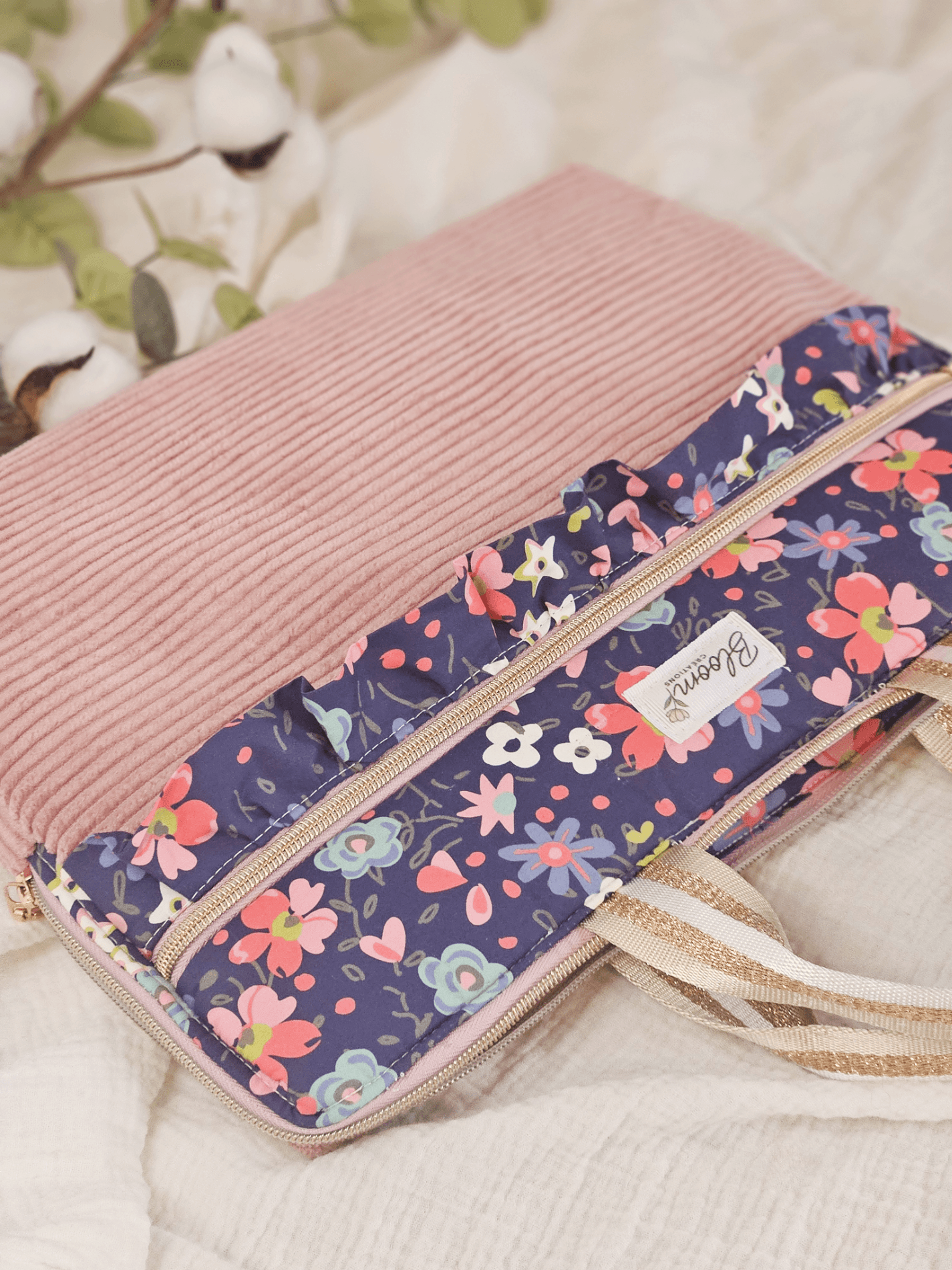 Confectionnée en velours côtelé rose certifié OEKO-TEX® et en popeline de coton fleuri imprimée en France, elle allie esthétique et praticité pour accompagner vos journées de travail, vos cours ou vos déplacements.