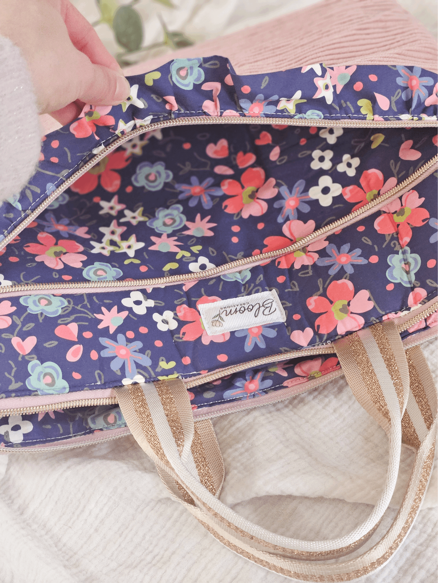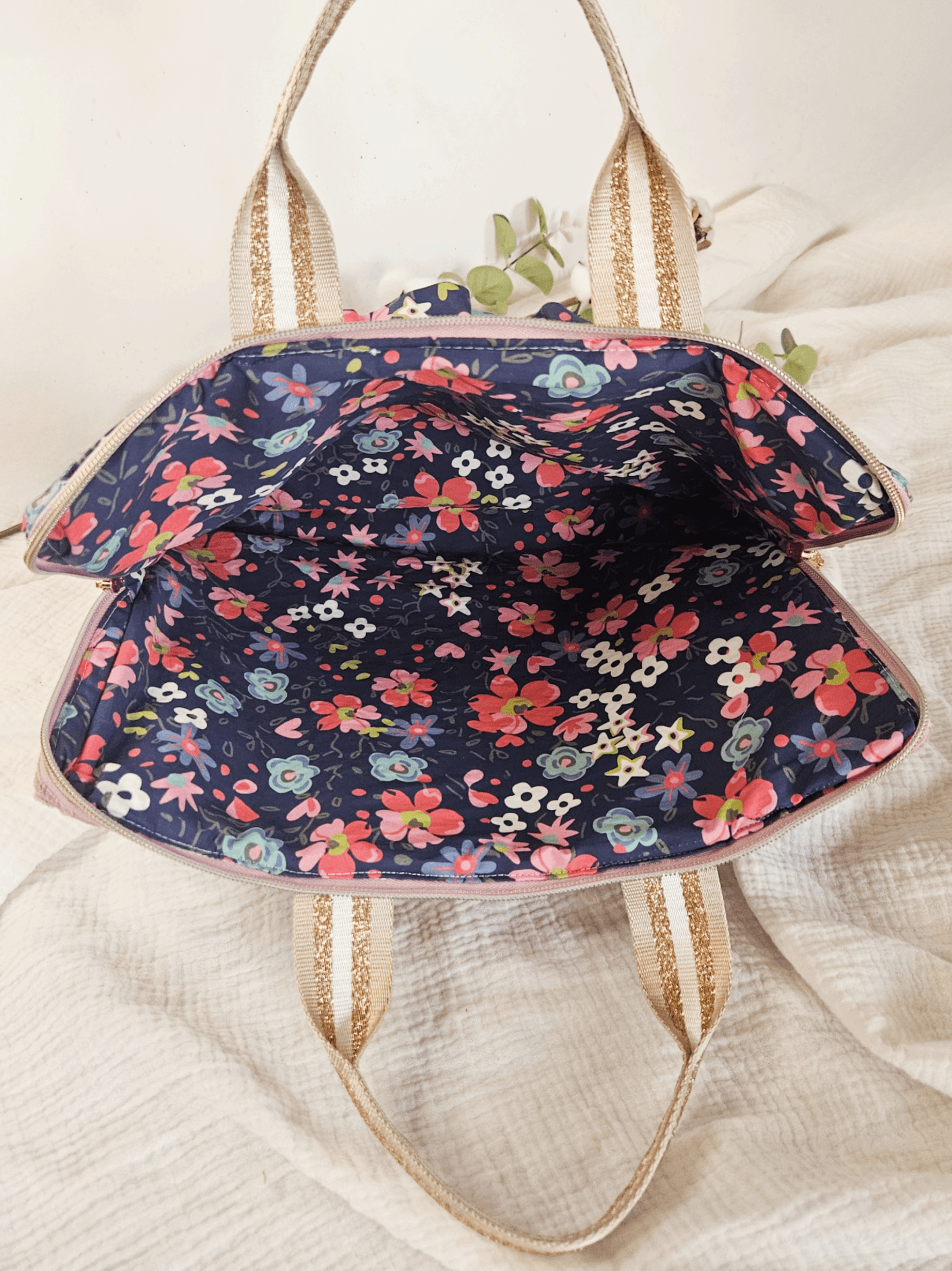 Le tissu fleuri utilisé pour les détails et la doublure est une popeline de coton certifiée GOTS.